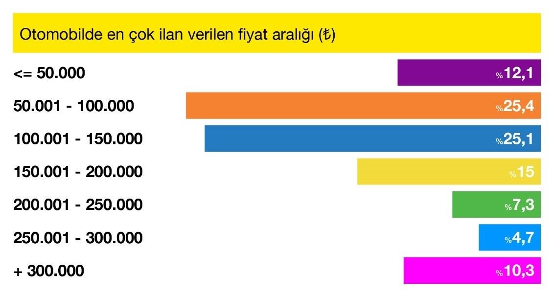 Tüm ilanlar arasında, araçların %37’si 0 – 100bin kilometre aralığında yer aldı. Otomobil ilanlarının %25,4’ü ise 50.000 – 100.000 TL aralığında satışa sunuldu.