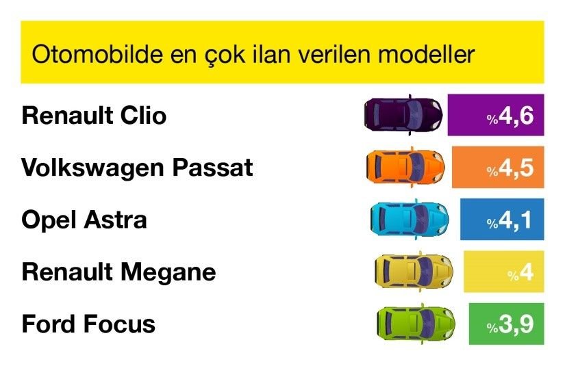 Şubat ayının en çok ilan verilen vasıta kategorisi Otomobil olurken Minivan & Panelvan, Arazi/ SUV & Pick-up, Ticari Araçlar ve Motosiklet, Otomobil ilanlarını takip etti. Marka & Model sıralamasında ilk iki Renault – Clio ile Volkswagen – Passat olurken Opel – Astra bir üst sıraya yükseldi ve sıralama Renault – Megane ve Ford – Focus ile devam etti. Şubat ayında en çok ilanı verilen Arazi/ SUV & Pick-up markası ise yine Nissan oldu.