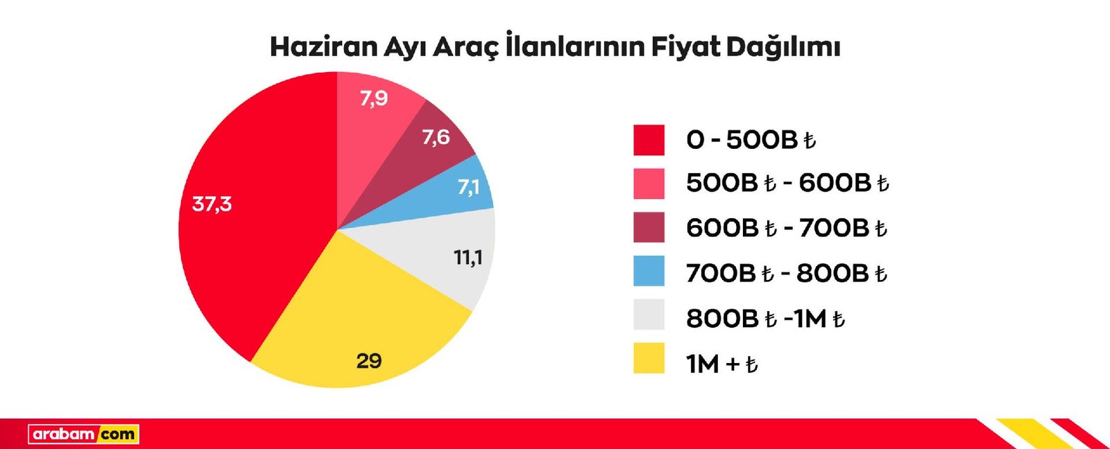 arabam.com verilerine göre, haziran ayında fiyat aralıklarına göre ilan oranları benzer seyretti. 1.000.000 TL ve üzerindeki araçların ilan oranı %29’a yükselerek bir önceki aya göre %1,7 puanlık artış gösterdi.