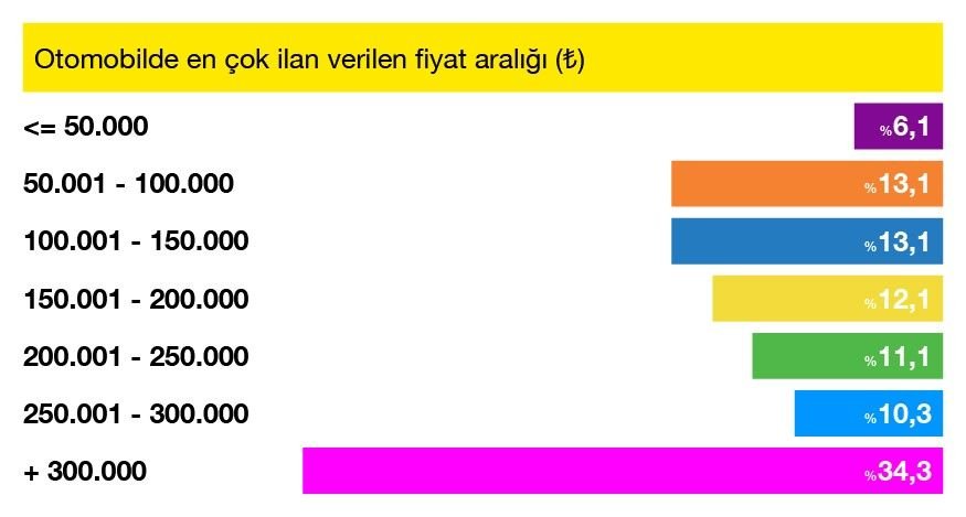 Tüm ilanlar arasında araçların %33,7’si 0 – 100bin kilometre aralığında yer aldı. İlanların %13’ü ise 50.001 – 100.000 TL ve 100.001 – 150.000 TL aralığında satışa sunuldu.