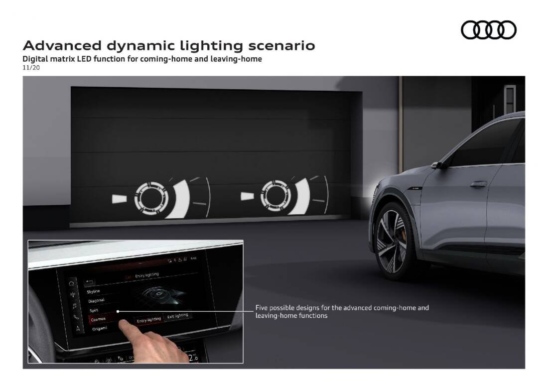 Araca binerken ve araçtan inerken kullanılan gelişmiş dinamik aydınlatma senaryoları, Audi’de ışık tasarımı ve ışık teknolojisinin ne kadar bağlantılı olduğunu gözler önüne seriyor. Kişisel aydınlatma efektleri kişisel tercihlerin bir ifadesi işlevi görüyor. Kullanıcı, MMI aracılığıyla istediği beş aydınlatma efektinden birini seçebiliyor. Bu beş farklı projeksiyon, DMD teknolojisi sayesinde uygulanıyor.