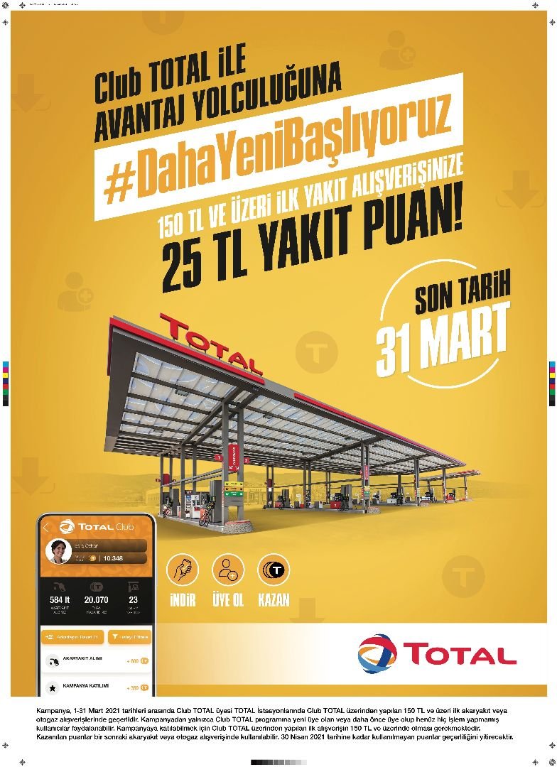 01-31 Mart 2021 tarihleri arasında geçerli olacak kampanya kapsamında TOTAL İstasyonlarında Club TOTAL üyeliği ile yapılacak tek seferlik 150 TL ve üzeri ilk işlemin ardından 25 TL değerinde yakıt puan, üyenin hesabına tanımlanacak. Kazanılan yakıt puanlar, 30 Nisan 2021 tarihi gün sonuna kadar Club TOTAL üyesi tüm TOTAL İstasyonlarında kullanılabilecek.