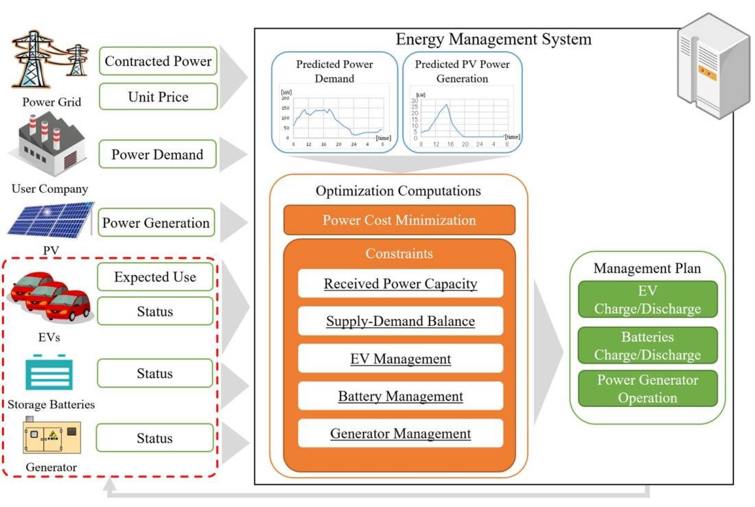 Mitsubishi Electric’in geliştirdiği yeni enerji yönetimi teknolojisinde kullanılan çok yönlü güç koşullandırma sistemi, pik saatlerde şebeke elektriği kullanımını azaltmak ya da başka kaynaklara yönlendirmek için minimum elektrik maliyetlerini hesaplıyor. Ayrıca fotovoltaik ve diğer elektrik üretimi sistemleri ile kullanıcının şirketinde park halinde bulunan elektrikli araçların şarj/deşarj işlemlerini koordine ediyor, elektrik ihtiyacına ve fotovoltaik elektrik üretim kapasitesine ilişkin tahminler yürütüyor. Tescilli modelin matematiksel programlama özelliği sayesinde alınan elektrik kapasitesi, arz-talep dengesi ve elektrikli araçlar ile sahadaki akülerin maksimum ve minimum şarj/deşarj seviyeleri şeklindeki sınırlamalar dikkate alındığında, şebekeden temin edilecek enerji miktarı, elektrik birim fiyatları, filodaki elektrikli araçların elektrik ihtiyacı ve öngörülen kullanım seviyesi gibi bilgilere dayalı olarak sahada elektrik üretimi ve elektrikli araç şarj/deşarj işlemleri için optimum bir plan hazırlanıyor.