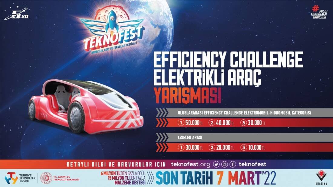 TEKNOFEST Havacılık, Uzay ve Teknoloji Festivali kapsamında TÜBİTAK tarafından düzenlenen Uluslararası Efficiency Challenge Elektrikli Araç Yarışları ile Liseler Arası Efficiency Challenge Elektrikli Araç Yarışları için başvurular devam ediyor. Tasarımından teknik donanımına kadar en verimli araçların ortaya çıkmasının amaçlandığı yarışmada; öğrencilerin araç teknolojileri konusunda bilgi birikimi ve deneyim kazanması hedeflenirken, konuyla ilgili araştırma imkânı edinip dünyadaki gelişmeleri takip etmesi de teşvik ediliyor. Alternatif ve temiz enerji kaynaklarının otomotiv sanayiinde kullanımını yaygınlaştırmak ve alternatif enerjilerin araç teknolojilerinde kullanımı konusunda kamuoyunun ilgisini çekerek, farkındalık oluşturmayı amaçlayan yarışma Elektromobil (batarya beslemeli elektrikli araç) ve Hidromobil (hidrojen enerjili elektrikli araç) olmak üzere iki kategoride düzenleniyor. Başvuruların 7 Mart’a kadar yapılabildiği yarışmaya Türkiye ve yurt dışında öğrenim gören T.C. vatandaşı veya yabancı uyruklu tüm lisans, yüksek lisans ve doktora öğrencileri ile lise öğrencileri katılabiliyor. Her iki kategoride de birincileri 50.000, ikincileri 40.000, üçüncüleri ise 30.000TL’lik büyük ödüller beklerken, lise seviyesinde birincileri 30.000, ikincileri 20.000, üçüncüleri ise 10.000TL’lik ödüller bekliyor.