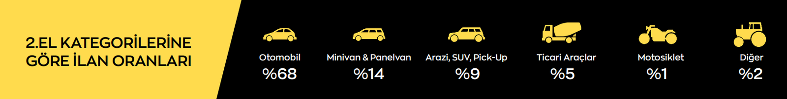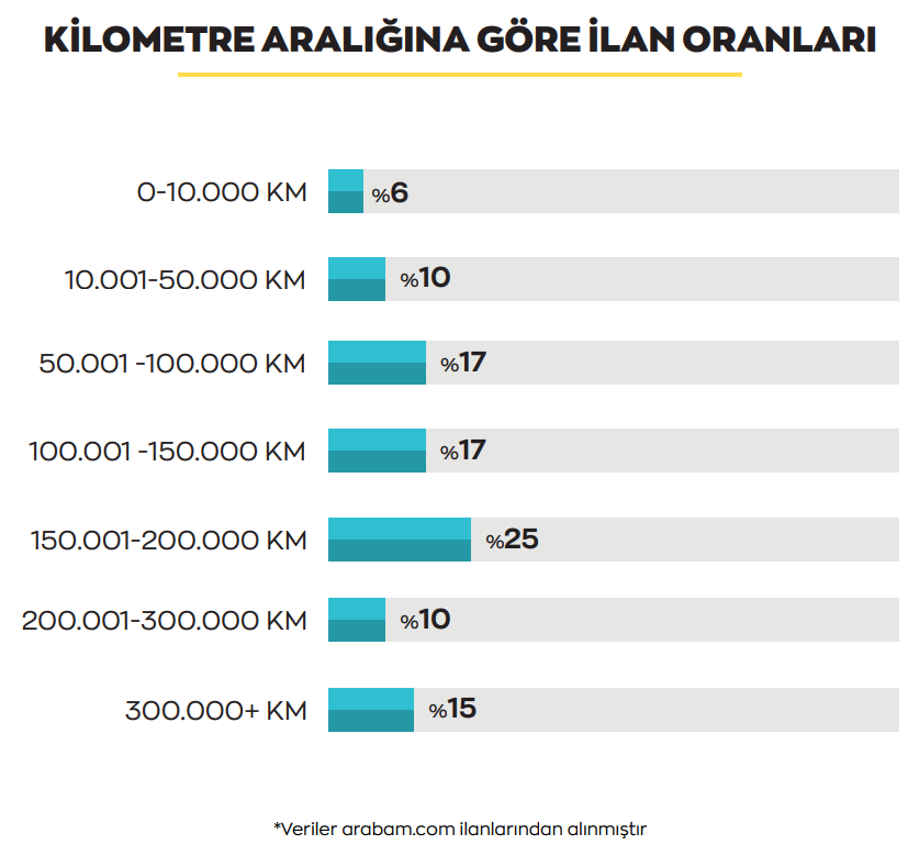 İkinci el piyasasında şubat ayında ilanlar en çok 150.000 km.- 200.000 km. arasındaki araçlar için verildi, bu km. aralığındaki araçların ilan oranı %25 oldu. Uygun fiyatlı, yüksek kilometreli araçlar revaçta. 50.000 km. – 100.000 km. ve 100.000 km. – 150.000 km. aralığındaki araçların ilan oranları %17 oldu, 200.000 km. – 300.000 km. aralığındaki araçların ilan oranı ise %10 oldu.
