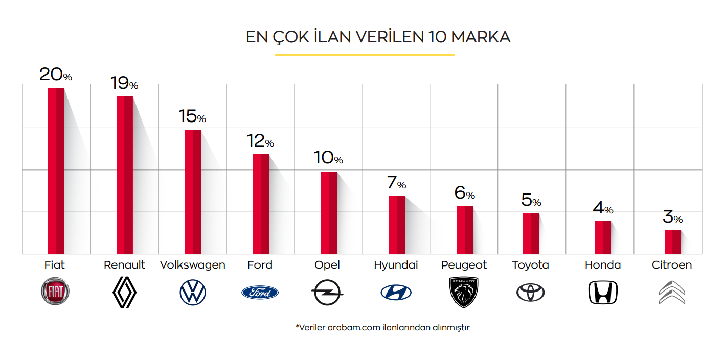 arabam.com’da verilen ilanlarda şubat ayında zirve Fiat markasının oldu. Bu markayı sırasıyla Renault, Volkswagen, Ford, Opel, Hyundai, Peugeot, Toyota, Citroen ve Honda izledi.