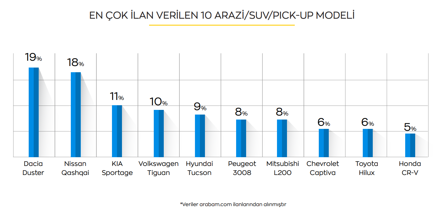 arabam.com`da yayınlanan 2.el Arazi/SUV/Pick-up ilanlarının oransal olarak değerlendirmesine bakıldığında en yüksek ilan sayısı, %19 ile Dacia Duster oldu. Bu aracı sırasıyla Nissan Qashqai, Kia Sportage, Volkswagen Tiguan, Hyundai Tucson, Peugeot 3008 izledi.