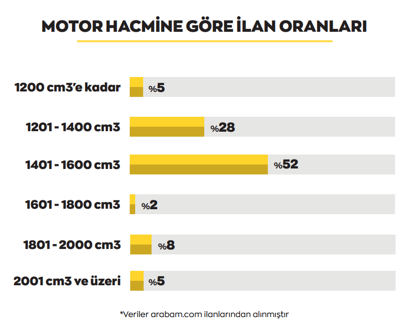 Motor hacmi arttıkça yakıt tüketimi ve MTV miktarları da arttığı için 1.6 altındaki motorların şubat ayında 2.el araç alımında daha çok tercih edildiği gözlemleniyor. 1.2 – 1.4 arası ve 1.4-1.6 arası motor hacimlerine sahip araç ilanları daha çok ilgi gördü. 1.2-1.4 arası motor hacmine sahip araçların ilan oranı %28 oldu, 1.4 – 1.6 arası motor hacmine sahip araçlar ise ilanların %52’sini oluşturdu. 2001 cm3 ve üzeri motor hacmine sahip ilanların oranı ise %5’te kaldı.
