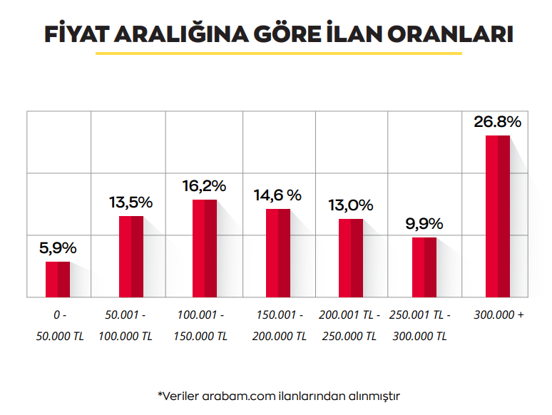 İlanlar içinde en yüksek payı %16,2 oran ile 100 .000 TL – 150.000 TL aralığındaki araçlar aldı. 150.000 TL – 200.000 TL aralığındaki araçlar ise ilanların %14,6’sını oluşturdu. 350.000 TL ve üzerindeki araç ilan oranları ise %19,9 oranında oldu.