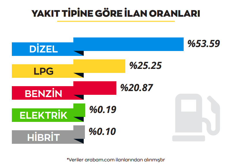 arabam.com ilanları yakıt tipine göre incelendiğinde, dizel araçların ilan oranı %53,59 oldu. LPG’li araçlar %25,25 oranı ile ikinci sırada yer aldı. Benzinli araçlar ise ilanların %20,87’sini oluşturdu. Benzinli araçları sırasıyla elektrikli ve hibrit araçlar izledi.