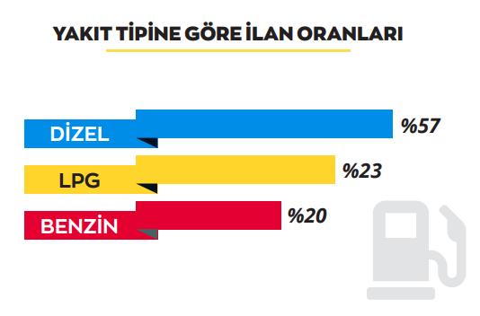 Kasım ayı için arabam.com ilanları yakıt tipine göre incelendiğinde, dizel motorların oranı Ekim ayında olduğu gibi %56,88 ile birinci sıradaki güçlü konumunu koruyor. Dizel araçları sırasıyla LPG ve benzinli araçlar izliyor. Benzinli araçlar %19,55 ile geçtiğimiz dört ayın en yüksek oranını yaşıyor.