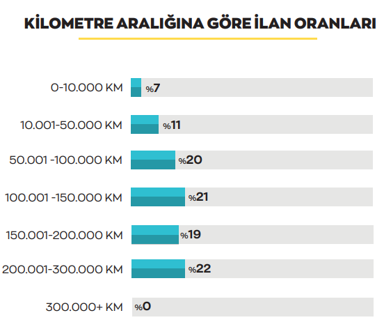 İkinci el ilan piyasasında 100.000 km üzerindeki araçlar Ekim ayında olduğu gibi Kasım ayında da daha çok görülüyor. 2020 yılında ikinci el araç fiyatlarındaki artışın etkisi ile daha uygun fiyatlı yüksek kilometreli araçlara talep devam ediyor.