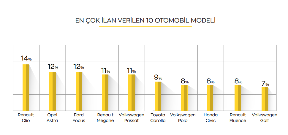 Ağustos, Eylül ve Ekim aylarında en çok ilan verilen marka olan Renault, Kasım ayında da %2’lik artış göstererek birinciliğini koruyor. Renault markasını sırasıyla Volkswagen, Fiat, Ford, Opel, Hyundai, Peugeot, Toyota, Mercedes – Benz ve BMW izliyor.