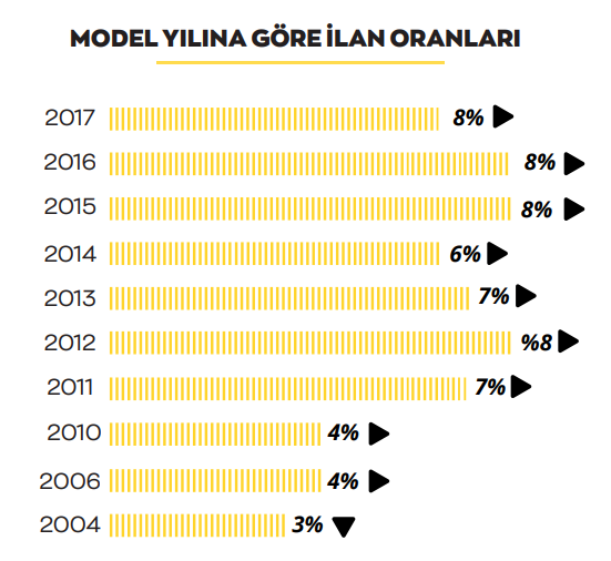 Kasım ayında en fazla ilan verilen araç model yılı %8,1 oranı ile 2015 model oldu. Bunu sırasıyla 2016, 2017 ve 2012 model araçlar takip etti. Bu yıllar arasındaki ilan sayılarının artışının Ekim ayındaki gibi devamı, bizlere sıfır km. araç fiyatında her ne kadar bir düşüş yaşansa da 2. el ve yaşı daha genç olan araçlara yönelimin devam ettiğini gösteriyor. İlanların model yılına göre oranları aşağıdaki gibi: