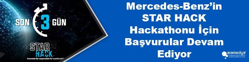 Mercedes-Benz Otomotiv Küresel IT Çözümleri Merkezi, inovasyon ve yaratıcılığa verdiği değeri, “STAR HACK” adıyla düzenleyeceği hackathon’da bir kez daha gözler önüne seriyor. 10 -12 Aralık tarihleri arasında Demirören AVM’de yer alan Nonstop Esports Arena’da düzenlenecek “STAR HACK” hackathon etkinliğine başvurular devam ediyor. Etkinliğin ilk günü olan 10 Aralık’ta teknik ve proje mentorları ile buluşacak olan katılımcılar, takip eden iki gün boyunca sürdürülebilir teknoloji çözümlerine odaklanacaklar ve bu konuda ürün, hizmet geliştirmek için yarışacaklar. 12 Aralık günü gerçekleşecek jüri değerlendirmeleri ile ilk üçe giren takımlar ödüllerin sahibi olacak.