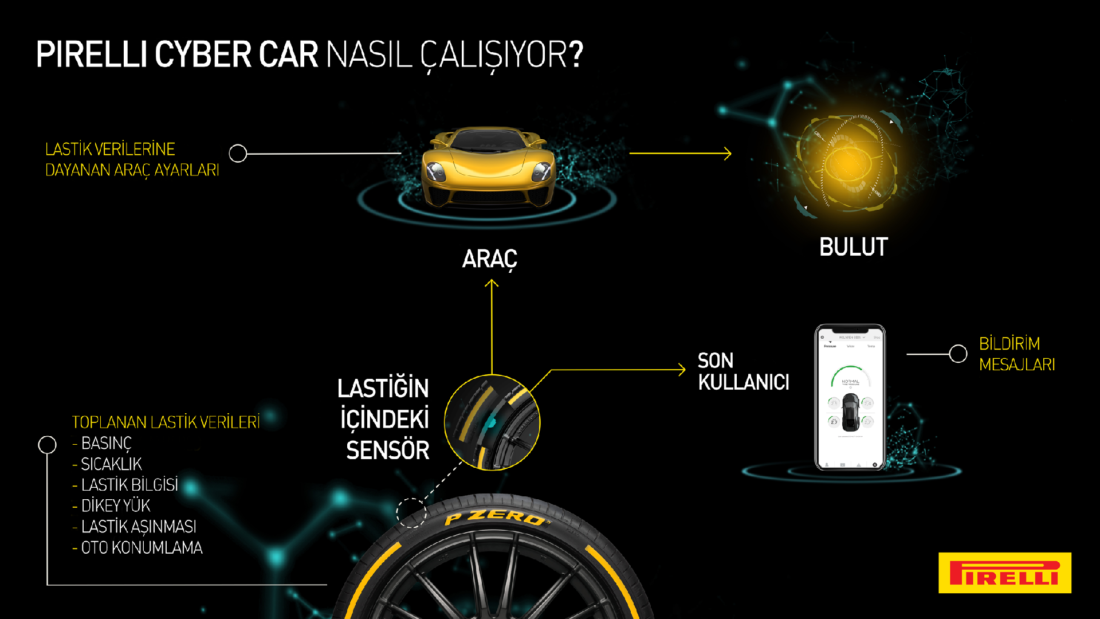 Cyber Car, lastiğin otomobilin elektronik ve özellikle sürücü destek sistemleriyle doğrudan etkileşim kurmasını, böylece otomobilin işleviyle ilgili önemli bilgilerini ileterek performansı geliştirip sürüşün daha güvenli olmasını sağlıyor. Yeni Pirelli sistemi, yıl sonuna kadar önde gelen otomobil üreticilerinin en yenilikçi elektrikli ve geleneksel otomobillerinde yer almaya başlayacak.