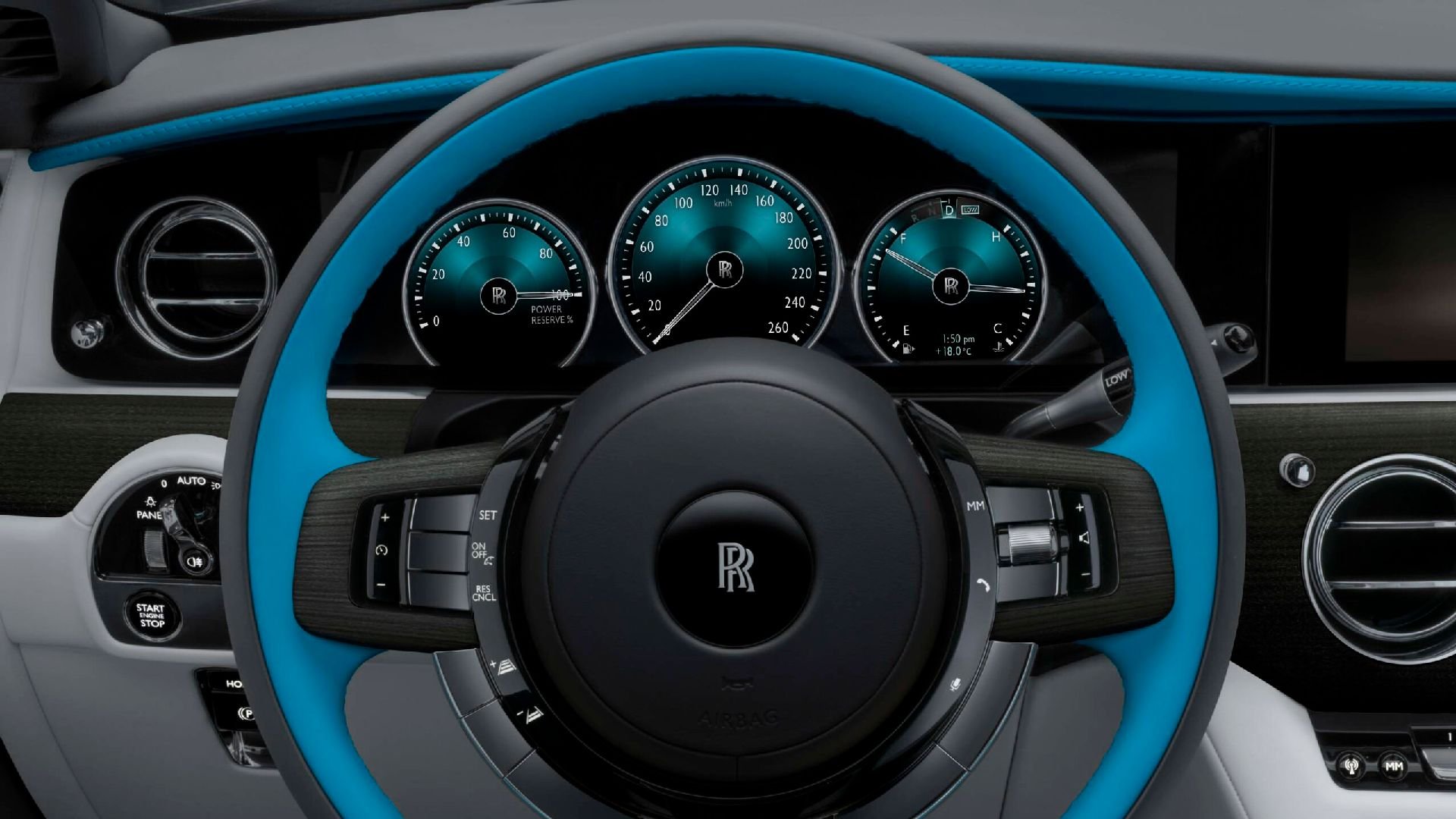 Sunulan örnek modelde gri özelinde Gunmetal rengi kullanılmıştır. Markanın stil kodlarına uygun Ghost Prism’in yan profil işçiliği, zanaatkarlar tarafından elle hazırlandı. Derin parlak siyah kaplama, on adımlı özenli bir süreçten geçti. Dört kat boya uygulandıktan sonra 16 saat boyunca el ile parlatıldı. Renk paletindeki nüanslı karışımlar, Turchese, Mandarin, Forge Yellow veya Phoenix Red olmak üzere dört dış vurgu seçeneğiyle sergileniyor. Müşteriler, iç mekân takımlarına neredeyse sınırsız sayıda özel renk seçeneği atayabiliyor.