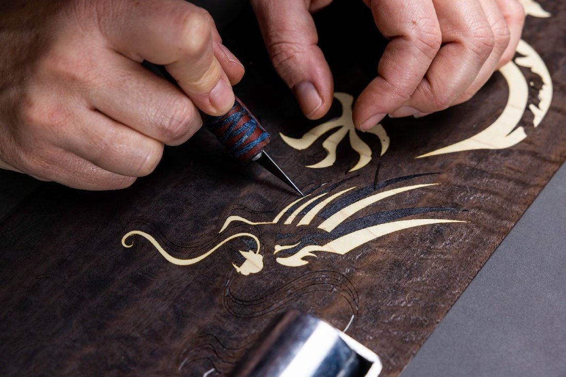 Phantom Dragon’un ön konsolunda yer alan Gallery, 297 bireysel parçadan ve dört farklı ahşap türünden yapılmış özel kaplama sanatını (Marquetry) barındırıyor. Rolls-Royce’un evindeki bir zanaatkar, bu çarpıcı özelliği oluşturmak için kaplama şekillerinin ince bir şekilde kesilmesi ve el işiyle birleştirilip sabitlenmesi süreçleri dahil olmak üzere üç ay uğraştı. Sanat eseri, dönen bulutlar içinde yer alan iki ejderhayı temsil ederken, onlar da Bespoke (özel üretim) saatiyle somutlaşan inciyi koruyor. Taban katmanı dumanlı okaliptüs ahşabından işlenirken, şekillerin sınırları sadece 0.5 mm genişliğinde çınar kaplamasıyla belirginleştirildi. Bulutların dokusunun taklit edilmesi için doğal damar yapısı sebebiyle kızıl meşe kabuğu kullanıldı. Siyah Bolivar kaplamasının ‘gölgeleri’ ejderhaların yüzeyin üstünde süzüldüğü izlenimi verirken tasarımın derinlik hissi kazanmasını sağladı.