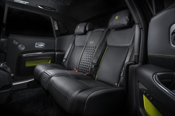 Ghost is presented in Gunmetal with an Iced satin finish upper and deep gloss lower, yet, this masculine, utilitarian palette is similarly invigorated by Lime Green pinstriping applied to the motor car’s wheel centres. Anthracite and Black hides are used for both front and rear seating while Lime Green piping and door pockets continue the exterior’s theme. An embroidered pattern on the rear seat armrest speaks of the Technical Fibre veneer and combines vibrant fine cotton with soft leather, further expressing the coachwork’s combination of gloss and satin qualities.