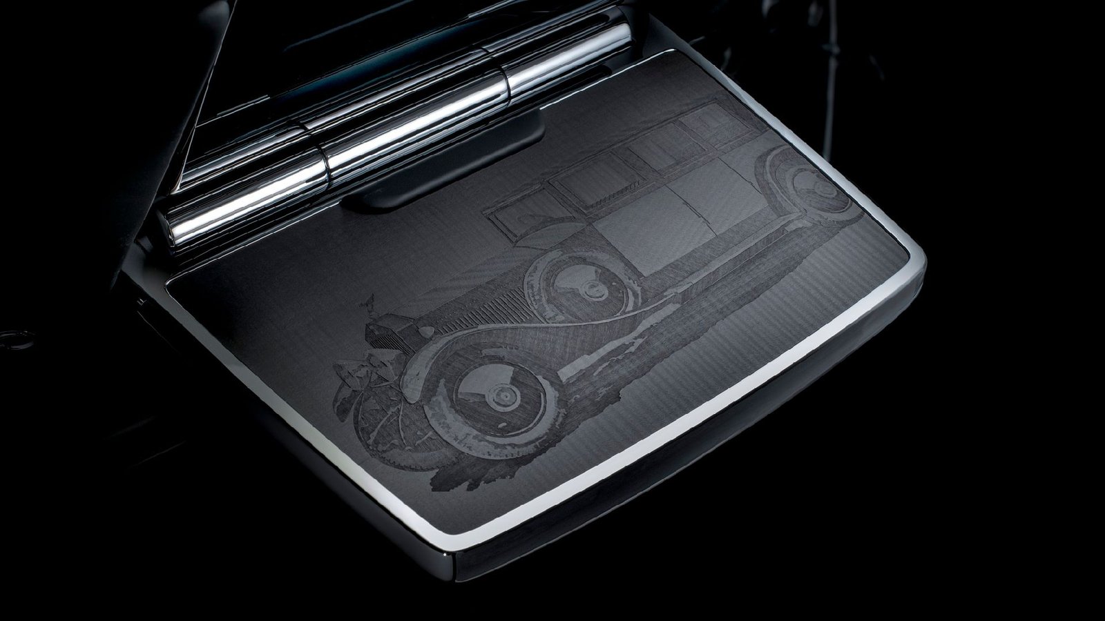 Kapılardaki ahşap yüzeyler, özenle işlenmiş deri panellere dönüştürülüyor. 24 ayar altın “yollar”, altın iplik işlemeler olarak devam ediyor; haritalar ve manzaraların detayları siyah iplikle işlenerek kapıların kaplamalı bölümündeki kazınmış detayları yansıtıyor. Ahşap işçiliği, 1925 model orijinal Phantom I ve günümüz Phantom VIII’in tasvirleriyle tamamlanıyor; her biri arka piknik masalarına özenle kazınmış olarak sunuluyor. Modeller, piknik masalarının deri kaplı arka yüzeylerindeki işlemelerde de yansıtılıyor; bu, geçmiş ile günümüzü bir araya getiren bir diğer ince detay olarak öne çıkıyor.