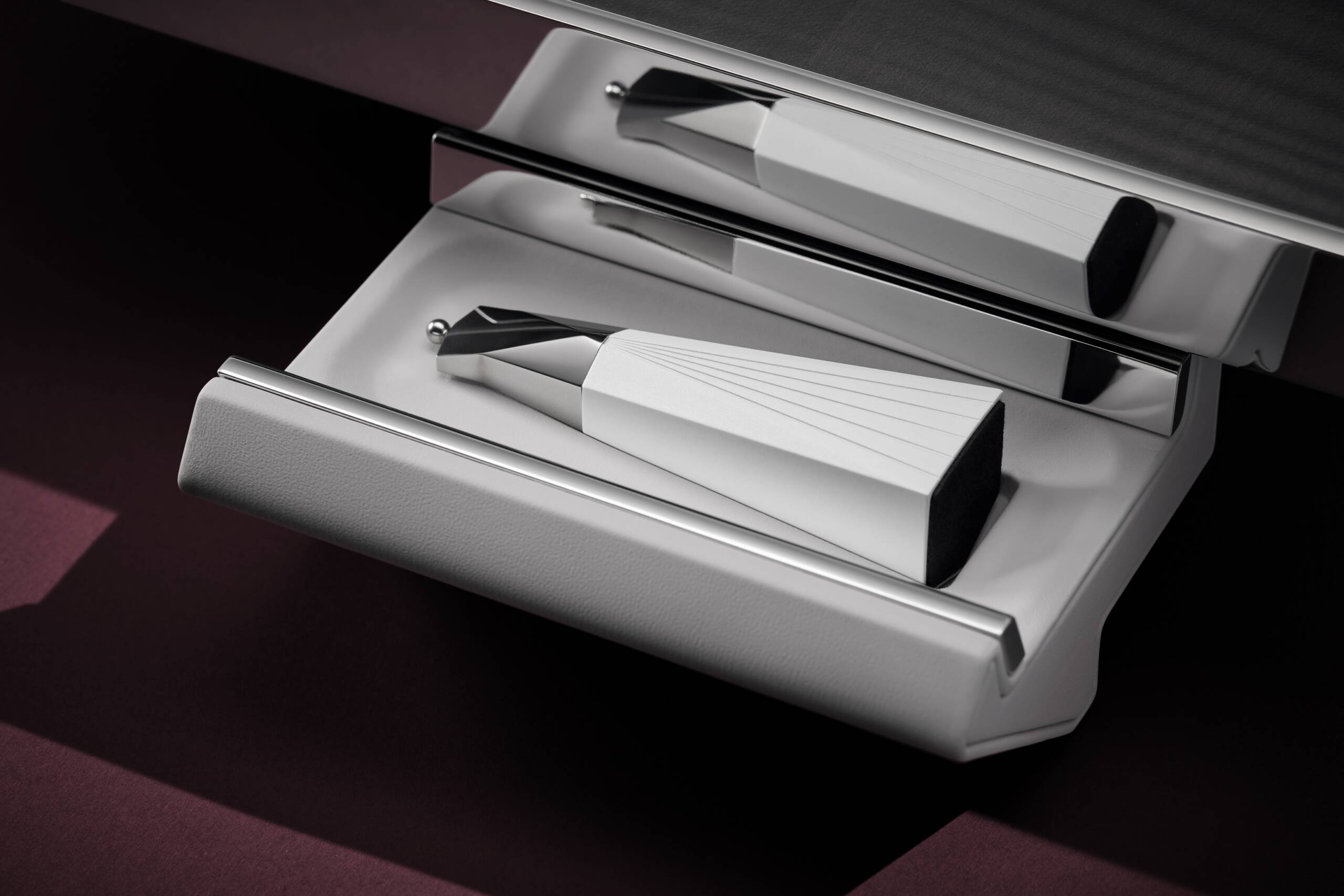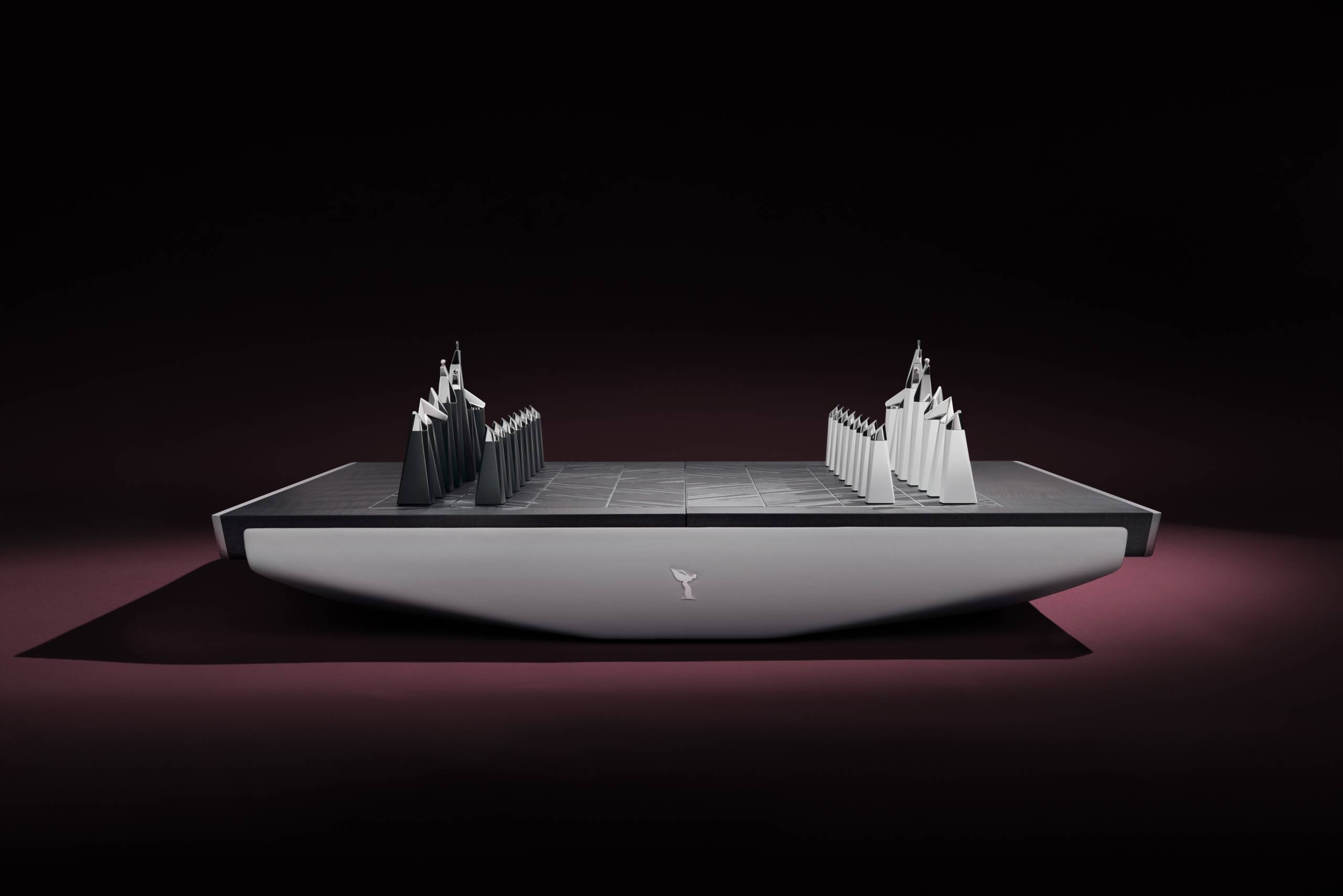 Satranç Seti, hareket hissini uyandıracak şekilde tasarlandı. Deri kaplı taban, merkezin etrafında hafifçe yükselerek, dar tabanı üzerinde sürülen bir izlenim bırakırken, Rolls-Royce araçlarının zarif hatlarını andırıyor.Oyun tahtası, deri kaplı yuvasını ortaya çıkarmak için mıknatısla tutulan parçaların yavaşça yükselmesiyle tek bir gösterişli hareketle açılıyor. Bu hareket, Rolls-Royce aracının kapılarının açılmasını andırıyor. Zahmetsiz bir deneyim için, oyun yüzeyinin altına yerleştirilen mıknatıslar, oyun sırasında parçaların mükemmel bir şekilde hizalanmasını sağlayarak her hamleye hassasiyet ve kararlılık katıyor. Tasarım ekibi, parçaları sabitleyen ve tahta üzerinde zahmetsizce hareket etmelerini sağlayan optimum mıknatıs gücünü belirlemek için altı farklı mıknatıs türüyle denemeler yaptı. Tahtanın her iki tarafında bulunan, hafif bir dokunuşla açılan gizli çekmeceler, oyun sırasında terfi ettirilen taşın yerine geçecek ek bir vezir içeriyor.Hem geniş tahtanın hem de satranç taşı tutucusunun kenarları, cilalanmış alüminyum çerçevelerle çevriliyor. Satranç setinin ön ve arkasına, Rolls-Royce’u simgeleyen cilalanmış alüminyumdan yapılan Spirit of Ecstasy amblemi zarifçe yerleştirildi.