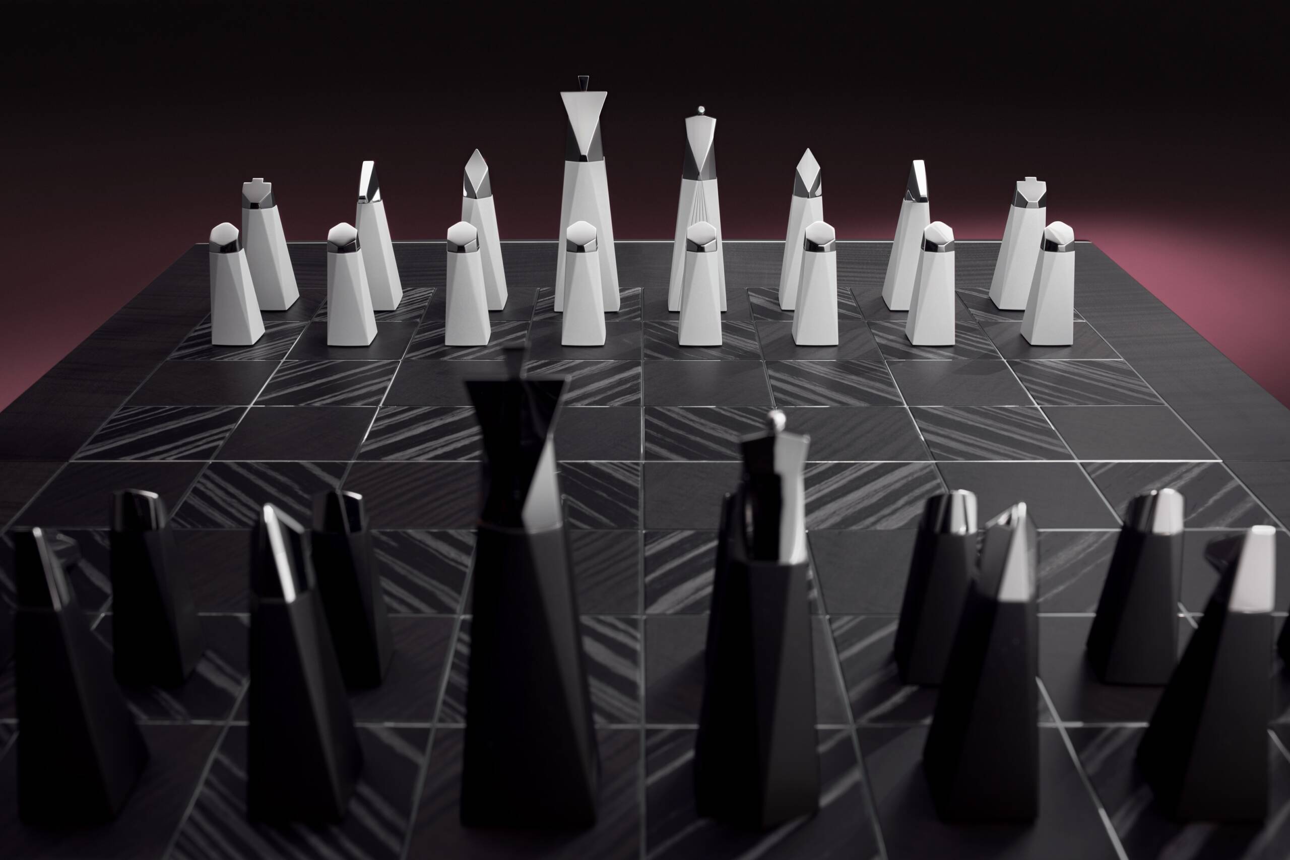 Her bir satranç taşı, çok yüzeyli bir yapıyla hassas bir şekilde üretilmiş olup, kendi başlarına heykelsi bir objeye dönüştü. Tasarımcılar satranç taşlarını tasarlamak için geleneksel satranç figürlerini incelediler ve bunları kare tabanlar halinde aşağı doğru genişletmeyi tercih ettiler. Heykelsi taşların her biri, seramik kaplamalı alüminyumdan üretilmiş olup, içerisinde gizli bir mıknatıs barındırıyor ve mücevheri andıran, parlak, paslanmaz çelik bir başlıkla taçlanıyor. Taşların ağırlığı, sağlamlığı ve dokunulduğunda hissedilen serinlik, Rolls-Royce araçlarında bulunan masif metal org düğmelerini bilinçli olarak çağrıştırıyor. Siyah satranç taşları saten bir yüzeyle tamamlanırken, beyaz taşlar zarif ışıltılı bir görünüme sahip.