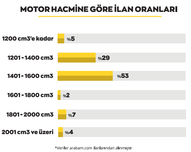 Motor hacmi arttıkça yakıt tüketimi ve MTV miktarları da arttığı için 1.6 altındaki motorların 2.el araç alımında ideal olduğu gözlemleniyor. Diğer aylarda olduğu gibi 1.2 – 1.4 arası ve 1.4-1.6 arası motor hacimlerine sahip araç ilanları liderliklerini korumaya devam ediyor ancak şubat ayında 1.2 – 1.4 arası motor hacmine sahip araçların ilan oranlarında %7’lik düşüş yaşanırken mart ayında 1.2 – 1.4 arası motor hacmine sahip araçların ilan oranları %11 artış gösterdi ve ilanların %29’unu oluşturdu, 1.4 – 1.6 arası motor hacmine sahip araçların ise ilan oranları %7 artış gösterdi ve ilanların %53’ünü oluşturdu. 2001 cm3 ve üzeri motor hacmine sahip ilanların oranı geçtiğimiz aralık – ocak aylarında artış gösterirken mart ayında %8 oranında düşüş yaşadı ve ilanların sadece %4’ünü oluşturdu.