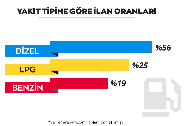 Şubat ayında arabam.com ilanları yakıt tipine göre incelendiğinde, benzinli araçların oranı %18,71 oldu. Dizel motorlu araçlar ise %56,56 oranı ile birinciliği kaptırmıyor. Dizel araçları sırasıyla LPG, elektrikli ve hibrit araçlar oluşturuyor. arabam.com’da mart ayında 50 adet elektrikli araç ilanı varken mart ayında bu sayı 66’ya yükseldi.