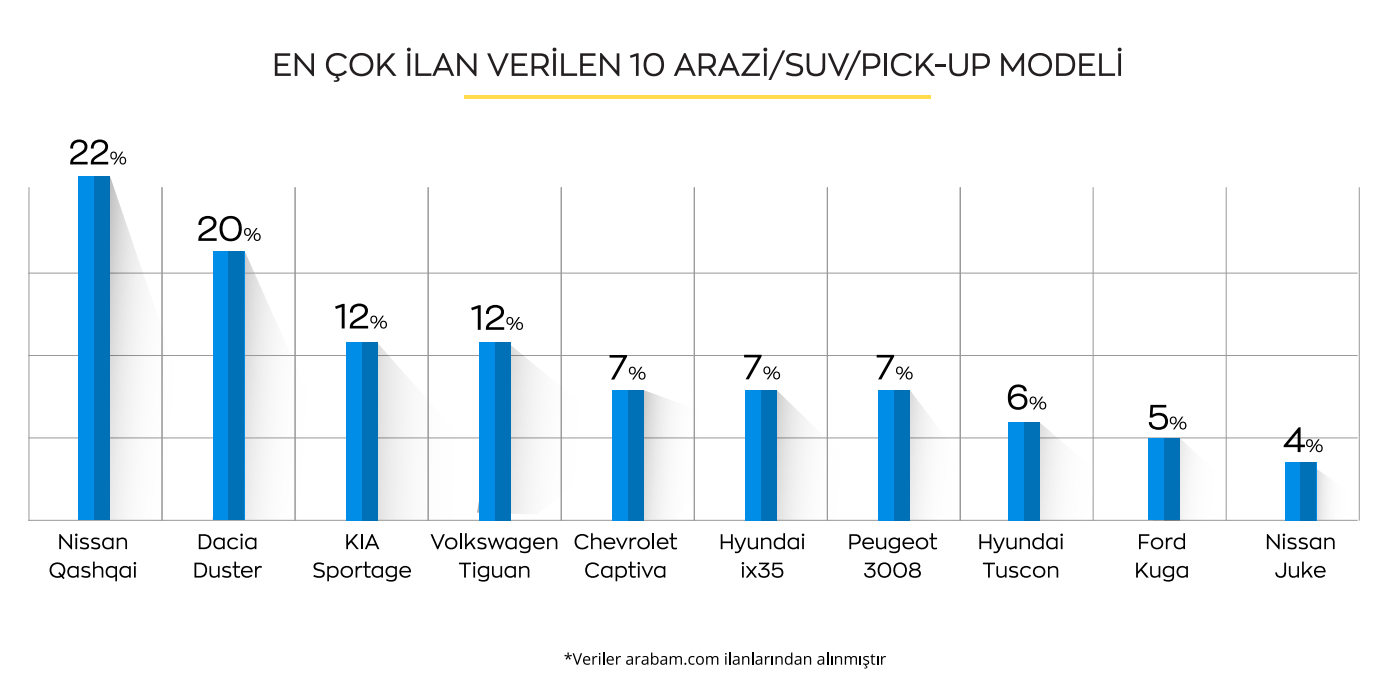 arabam.com`da yayınlanan 2.el Arazi/SUV/Pick-up ilanlarının oransal olarak değerlendirmesine bakıldığında en yüksek ilan sayısı, %22 ile yine Nissan Qashqai`nin oldu. Onu sırasıyla Dacia Duster, Kia Sportage, Volkswagen Tiguan, Chevrolet Captiva, Hyundai ix35, Peugeot 3008 ve Hyundai Tucson izliyor.