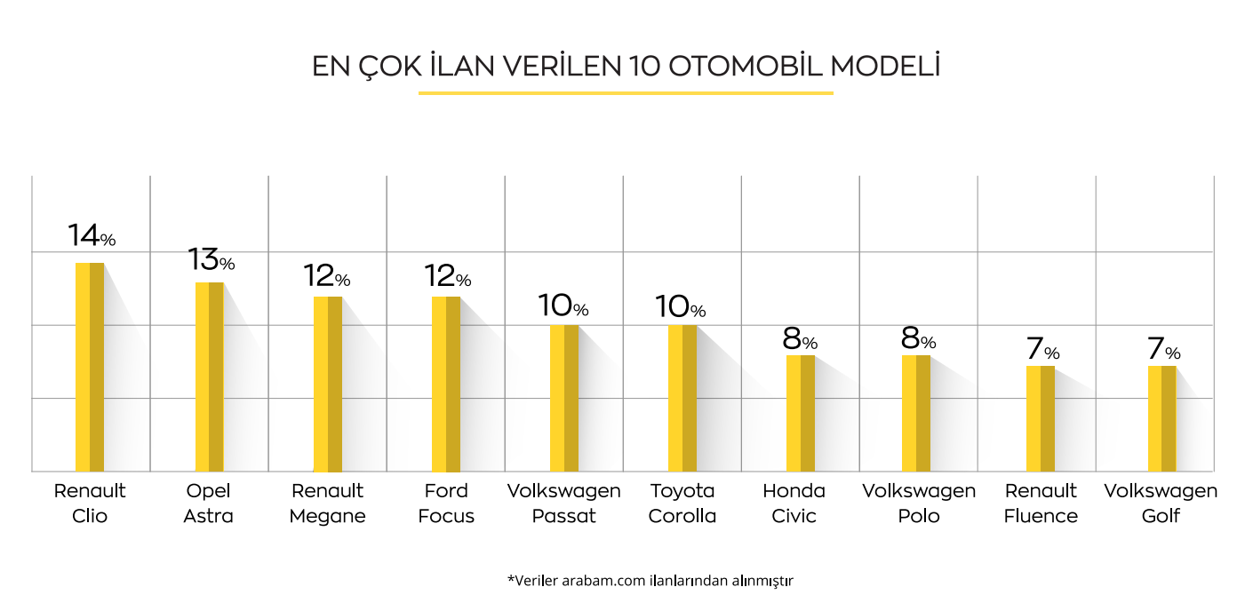 İlanlara model özelinde bakıldığında mart ayında en çok ilan verilen otomobil modelleri Clio, Astra ve Megane oldu. Astra ve Focus’un tercih edilme oranı %1 düştü. Bu üç modeli ise sırasıyla Focus, Passat ve Corolla takip ediyor.