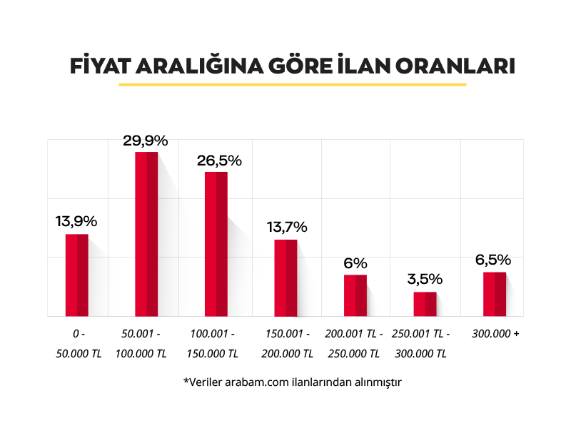 İlanlar içinde en yüksek payı mart ayında da 50 bin – 100 bin TL aralığındaki araçlar alıyor. Diğer fiyat aralığındaki ilan sayılarında ise genel bir düşüş söz konusu. 100 bin – 150 bin TL aralığındaki araçlarda ise %1’lik artış görünüyor.