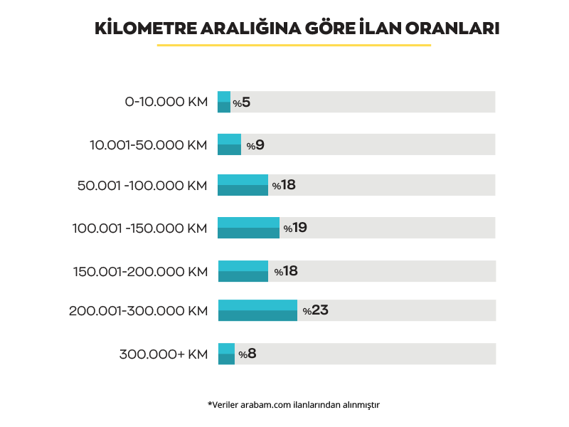 İkinci el ilan piyasasında mart ayında en çok ilgiliyi 200.000 km.- 300.000 km. arasındaki araçlar görüyor. Uygun fiyatlı, yüksek kilometreli araçlara da talep devam ediyor. 50.000 – 100.000 km. aralığındaki ilan oranlarında ise %2’lik düşüş yaşanıyor.