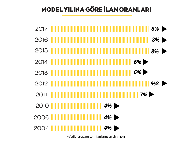 arabam.com’da mart ayında en fazla ilan verilen araç model yılı %8,2 oranı ile 2017 modeller oldu. Bunu sırasıyla 2016, 2015 ve 2012 model araçlar takip etti. 2000 yılı ve öncesine ait araçlar ise ilanların %13’ünü oluşturuyor. İlanların model yılına göre oranları aşağıdaki gibi: