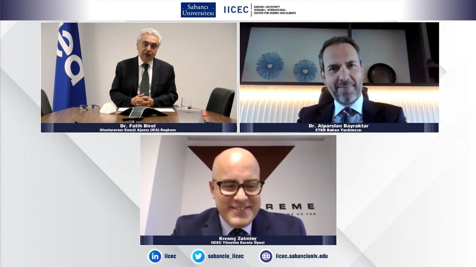 Sabancı Üniversitesi İstanbul Uluslararası Enerji ve İklim Merkezinin (IICEC) düzenlediği  “Dünyada ve Avrupa Özelinde net Sıfır Emisyon Geleceği ve Türkiye’ye Etkileri” konulu webinar düzenlendi. T.C. Enerji ve Tabii Kaynaklar Bakanlığı (ETKB) Bakan Yardımcısı Dr. Alparslan Bayraktar’ın onur konuşmacısı olarak yer aldığı webinar, IICEC Yönetim Kurulu Üyesi Kıvanç Zaimler ve Uluslararası Enerji Ajansı (IEA) Başkanı Dr. Fatih Birol’un katılımıyla yapıldı. Toplantıda; net sıfır emisyon kararlarının dünyayı ve Türkiye’yi sanayi, ticaret, ihracat ve enerji dönüşümü başta olmak üzere birçok farklı alanda nasıl etkileme gücünün olduğu ele alındı. 2050 yılında hedeflenen net sıfır emisyona ulaşılabilmesi için dünyada yılda 2 trilyon dolar olan enerji yatırımlarının 5 trilyon dolara çıkması gerekliliğinin önemi anlatıldı.