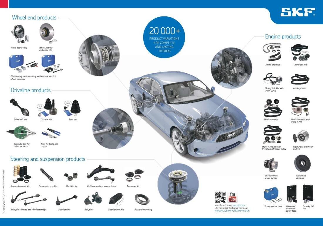 En eski modellerden en son teknolojilere kadar her marka araçta kullanılan şase, güç aktarma organları ve motordaki her çeşit rulman ve aksesuarlarını SKF kutusu içerisinde bulmak mümkündür. Bu özelliği ile SKF tek marka altında en geniş ürün gamına sahip rulman üreticisi olma özelliğini de taşımaktadır. SKF ürün çeşitliliğine aşağıda göreceğiniz gibi, rulman ürünlerinin yanında aks, aks kafası, komple aks, körük, süspansiyon kolu, amortisör koruma kitleri, süspansiyon takozları, salıncak kitleri, rot başı ve rot mili kitleri, rotil, denge kolu ve direksiyon körükleri gibi araç tamirinde işinizi kolaylaştıracak birçok ürünü de tek marka altında dahil etti.
