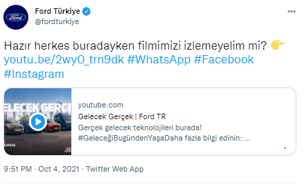 Diğer yandan Türkiye’de de otomotiv markaları Twitter’ı aktif kullanıyorlar. Twitter’da genelde markalar yeni modellerini ve kampanyalarını duyururken, özellikle özel günleri ve gündemi de takip ederek kitleleriyle en aktif şekilde iletişime geçmeye çalışıyor, işte birkaç örnek;