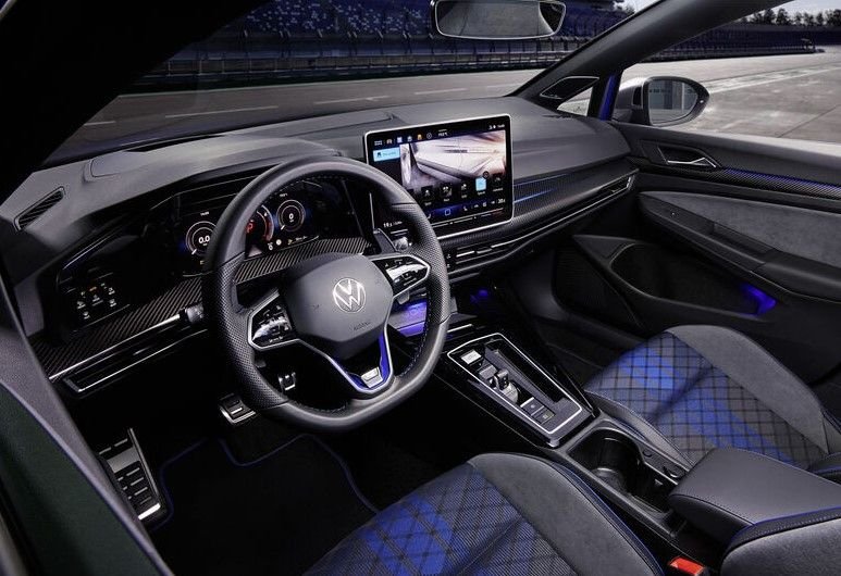 The interior of the Golf R models is ergonomically tailored to the driver and exclusively refined in the “R” style. The driver and front passenger sit on top sports seats with integrated head restraints. There will again be an optional black nappa leather interior with carbon-look elements with blue applications in the side area and an “R logo” in the seat backrest. Also available as an option: interior applications in real carbon. These equipment details underline how high-quality the exclusive overall concept of the new Golf R has been designed.