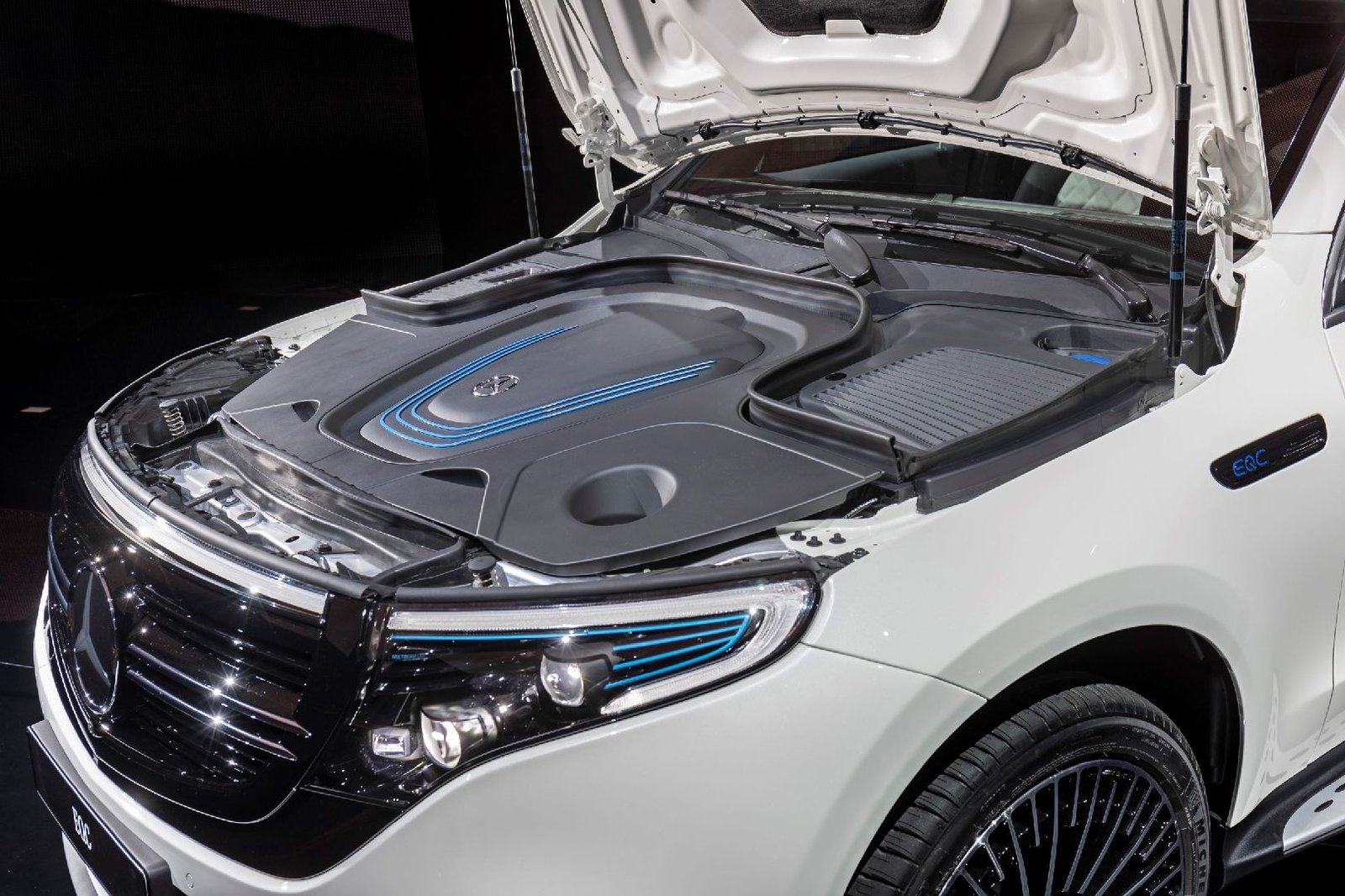 Önden bakıldığında farları ve ön ızgarayı çevreleyen siyah panel yüzey dikkat çekiyor. Bir ilk olarak siyah panelin üst kenarı fiber optik bir hat ile dolduruluyor. Söz konusu hat, gündüz farlarını birbirine bağlaması ile karakteristik bir Mercedes-Benz özelliği olarak öne çıkıyor. Bu yapı karanlıkta neredeyse kesintisiz bir ışık bandı oluşturuyor. Standart olarak sunulan MULTIBEAM LED ön farların iç yuvaları ve tüpleri çok parlak bir siyah renge sahip. Beyaz zemin üzerine mavi şeritler ve mavi tonlardaki MULTIBEAM gibi zıt renk vurguları bu modelin yeni EQ ailesinin bir üyesi olduğunu teyit ediyor.